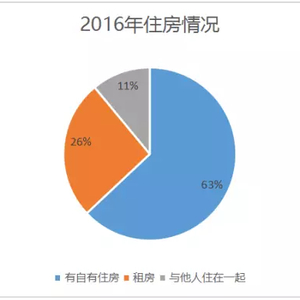 美国居民调查的2016年月度数据显示,63%的受访者有房,26%的人在租房,11%的人与其他人租住在一起(如下图所示)。在无房的人里面,有59%的人年龄在34岁以下,64%的人年收入低于5万美金,43%的人住在郊区。