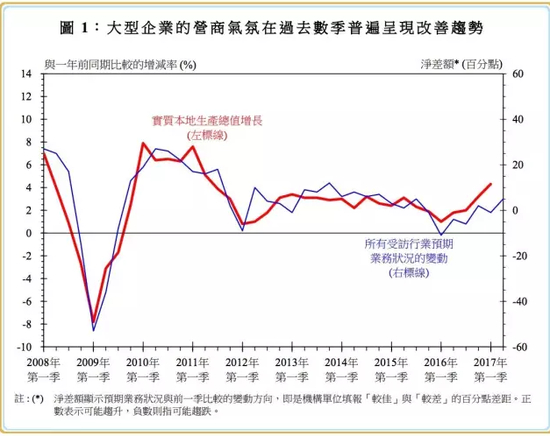 政府统计处最新一季度的业务展望统计调查显示,收集本港超过500家大型机构单位的意见,香港大型企业的整体营商气氛在过去数季普遍呈现改善趋势,预计未来营商环境还会呈现向好趋势。(图片来源:香港政府2017年第一季经济报告)
