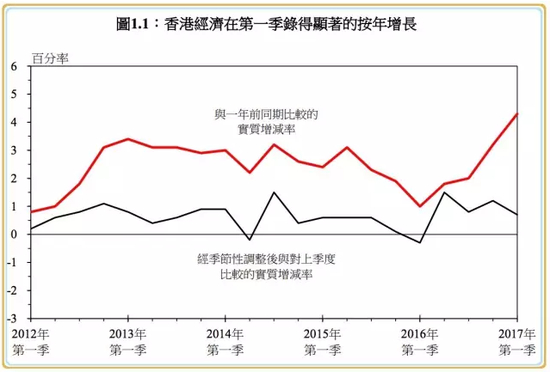 2017年第一季,香港经济较去年同期显著增长4.3%,保持自去年第二季开始呈现的向好势头。全球经济环境继续改善,外部需求因而持续转强。就业情况良好,加上营商气氛好转,内部需求亦保持强韧。(图片来源:香港政府2017年第一季经济报告)