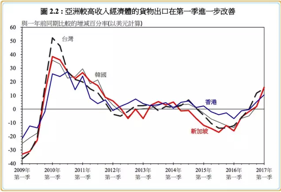 环球需求增强,加上亚洲区经济表现持续改善,刺激香港区内制造业活动扩张,继而带动原材料、半制成品及资本货物的进口需求,为区内贸易往来提供增长动力。(图片来源:香港政府2017年第一季经济报告)
