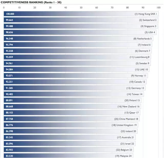 熟悉商科的港漂们对瑞士洛桑国际管理发展学院(IMD)一定不会陌生,它是全球顶级的商学院,被誉为欧洲第一、全球第三。全球竞争力报告的数据源自于已被大多数国家所承认的洛桑全球竞争力评价体系,简称“洛桑报告”,权威性毋庸置疑。