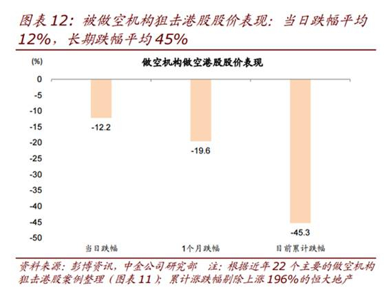 中金公司分析师王汉峰在研报中指出,通过研究近年来被做空机构狙击的22个主要港股案例可以发现,无论最终质疑被证实与否,做空报告平均造成股价当日暴跌10%,如果财务造假无法澄清,长期跌幅可能超过50%,甚至长期停牌进而退市。