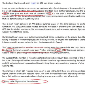 报告开篇直指高谭市研究对瑞声科技的报告“简直就是垃圾”。大致内容就是说,在我们从事做空研究的6年时间里,我们遇到了很多批判报告,虽然有些报告的观点我们并不赞同,但至少还能明白其中逻辑。但是高谭市研究连最起码的基本逻辑和常识都没有,可以说自身报告都存在造假嫌疑。通过前期详细尽调,对AAC(瑞声科技)的评价反而是“Rather impressed”(中文大意是厉害得让人印象深刻)。顺便还补刀一句:这种证据薄弱的沽空报告,只是想吓一下不明真相的吃瓜群众,让他们进行抛售(It’s easy to be frightened of the unknown)。