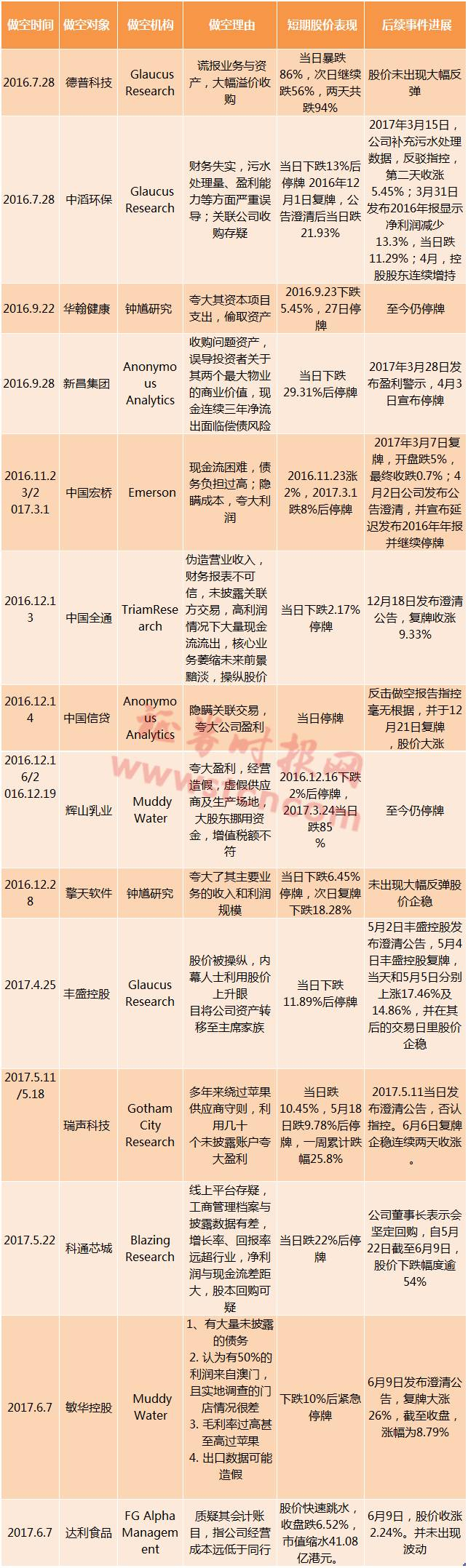 其三,沽空机构2016年下半年以来屡屡得手,堪称战绩辉煌。尤其3月24日浑水做空辉山乳业后,内地投资者对做空报告更为重视,今年5月以来,沽空机构出具的报告对目标公司股价的下跌几乎达到了立竿见影的效果。