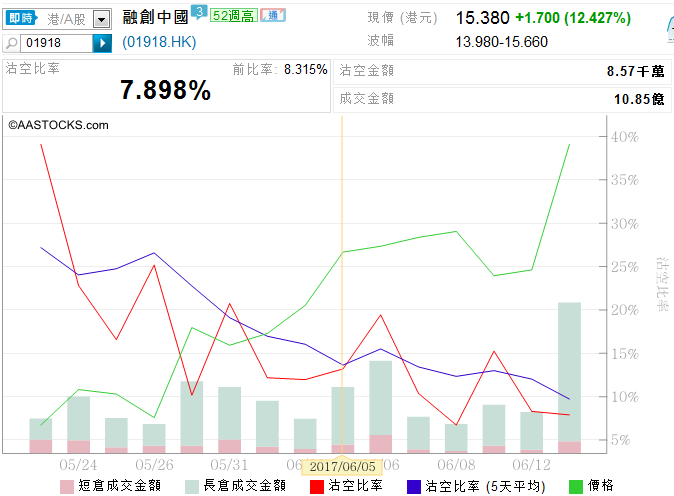 1、如果说长城汽车在12日的大涨有些“逼空”的趋势,那么融创中国此番大涨并未显现这样的趋势。长城汽车被外资长期看空,积压了大量沽空盘,截至6月2日,总量达7.06亿股,占流通股本22%。而融创中国的沽空盘少,根据香港证监会数据显示,截至6月2日,其淡仓股约2.54亿股,仅占流通股本6.5%。
