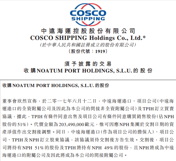 果然到了第二天,中远海控发布公告称,公司控股子公司中远海运港口(西班牙)以2.03亿欧元(约合15.5亿元人民币)的价格,收购TPIH所持有的西班牙Noatum港口控股公司(NPH)51%的股权。