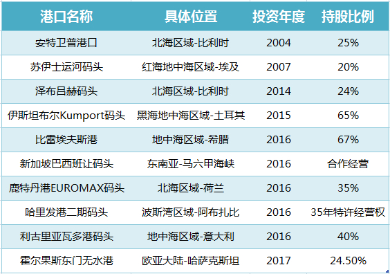 港口是一个国家的命脉,谁也不会轻易让出控制权,因此中远选择了多公司并购的策略,以避免战略野心抗性,对实力较好国家的重点港口,先参股或合作经营码头建立关系,对相对贫穷的国家则用经营带动其经济,力图取得码头控制权。近几年中远海控收购的港口如下表所示: