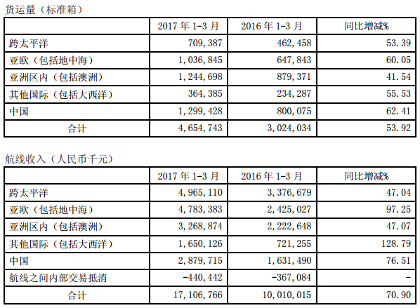 其实,抛开这些“不靠谱”的猜测,中远海控的一季报也给出了令人满意的答卷:截至2017年3月31日止第一季度,公司的营业收入达到了人民币201亿元,较上年同期增加48.14%,实现集装箱航运及相关业务收入193.38亿元人民币,同比增加78.44亿元人民币,增幅68.24%。