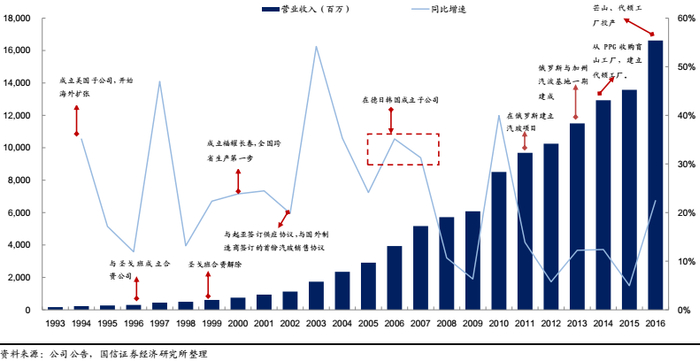 福耀一直具有出海的基因,早在1991年,福耀就开始向加拿大出口汽车玻璃,2004年实现与海外主机厂同步设计,2013年在俄罗斯的一期生产基地投产,2014年收购美国PPG旗下的浮法玻璃厂,2016年美、俄工厂相继投产,生产逐步全球化。