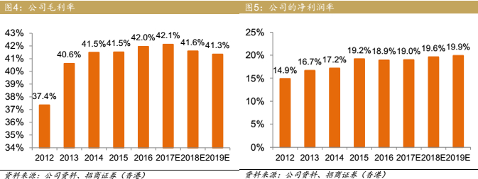 2016年,福耀营收和利润分别增长22.45%、20.53%(扣除一次性冲回,净利润增长为26.46%),而2017年一季度营收和净利润继续增长17.68%、18.83%。实际上,福耀的毛利率非常高,在2013年之后维持在40%以上,而净利润率近几年维持在19%左右,这在制造行业并不多见。