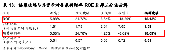 目前福耀的盈利能力最为强大,净资产收益率(ROE)达到18.13%,远远超过同行,板硝子甚至亏损严重。虽然义信玻璃的ROE更高,但是义信主要生产浮法玻璃,汽车玻璃的体量非常小,因此对福耀构不成威胁。