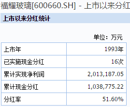 据Wind数据,福耀从1993年上市以来,累计分红金额高达103亿人民币,分红率超过51%,近三年平均分红率为66.6%,位居汽车零部件行业第一,分红比例非常惊人,在A股、H股都找不出有几家类似的,“慈善大王”曹德旺可以说是发钱毫不手软。而贵州茅台2001年上市以来分红率不过29.7%,福耀更胜一筹。