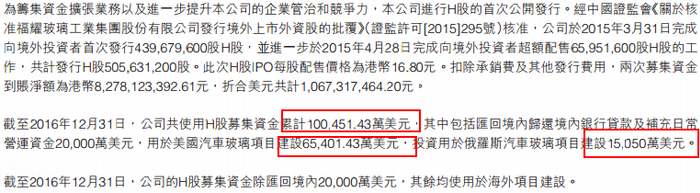 福耀港股在2015年3月份上市,募集资金净额10.67亿美元(约82.7亿港币),目前这笔资金基本已经使用完,6.54亿美元用于美国汽车玻璃项目,1.5亿美元用于俄罗斯项目,其余2亿美元用于偿还贷款等。