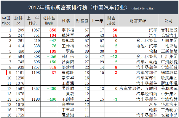 曹德旺在2017年福布斯富豪榜(中国汽车行业)以18亿美元排第9名,随着福耀股价连创新高,个人财富进一步增加。