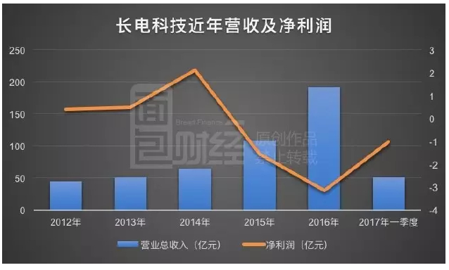 长电科技在财报中表示星科金朋业绩下滑主要受到行业需求疲软以及个别大客户订单下滑等因素影响,通过收购后一系列整合措施的实施,2016 年第三季度经营状况明显改善,盈利能力逐渐恢复,2016 年 10 月、11 月单月已基本实现盈亏平衡。 但是,受到星科亏损影响,长电科技去年出现了近10年以来的最大幅度亏损。2016年,公司净利润为亏损3.16亿,且从今年一季度报来看,公司经营情况并未出现好转,净利润为亏损1.05亿元。以下为面包财经根据公司财务数据绘制的其今年营收及净利润变化趋势图: