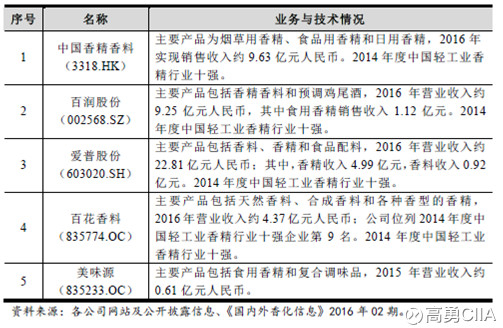 香精属于个性化订制的产品,香精生产企业的产品也各有侧重。目前与公司香精产品存在竞争的主要企业有: