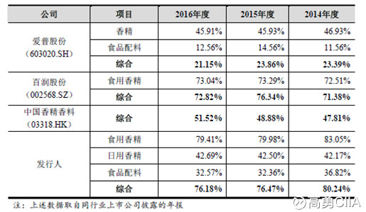 (1)爱普股份的香精包含了食用香精及日用香精,其主要客户为食品企业,而公司食用香精的下游客户以烟草企业为主,故导致了爱普股份的香精毛利率低于本公司水平。