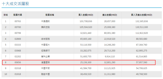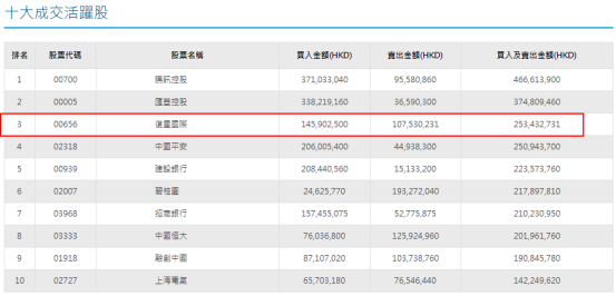 在盘后港交所披露的港股通沪深十大成交活跃股中,均出现了复星国际的身影。数据显示,进出该股的南下资金的合计3.1亿港元,占其总成交额的39%。不过在买卖过程中,两市资金出现了分歧,港股通沪为净买入(3837万港元),港股通深为净卖出(765万港元)。