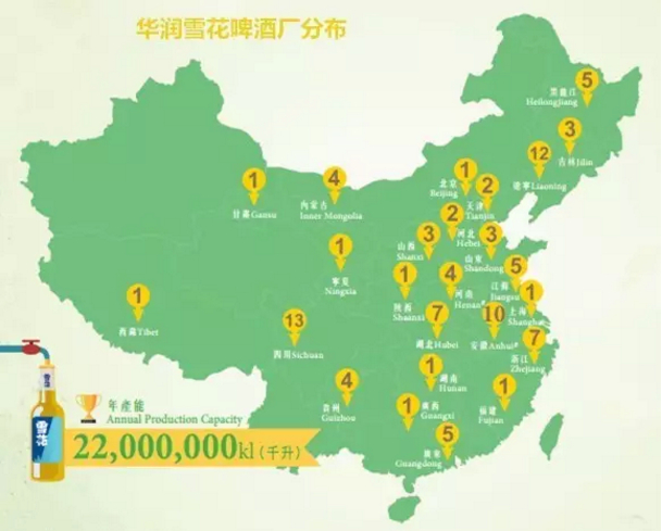 中国大陆,除了重庆、江西、云南、青海、新疆,其他地区都有华润雪花的啤酒厂。即使有些省份没有设厂,还是能通过邻省覆盖,比如说华润雪花在西藏和青海交界的昌都设厂,就是为了同时覆盖两省。