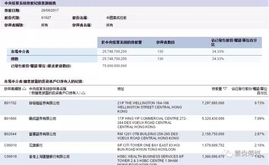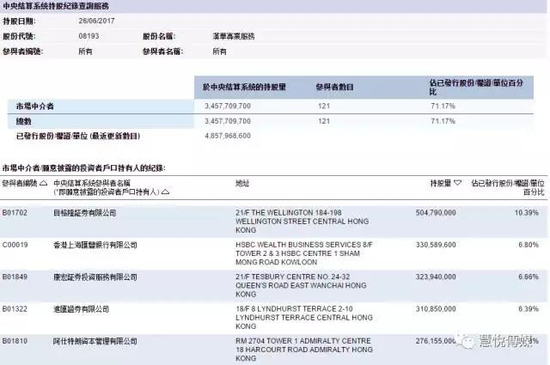 从中央结算系统的数据来看,的确跌幅榜上的汉华专业、中国集成控股有一家名为贝格隆的证券公司分别持有9.73%和10.39%的股份。而贝格隆证券公司,就是隆成金融旗下企业,也就是“粉哥”旗下。
