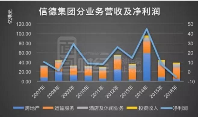 信德集团2015年营收及净利润显著下滑,2016年,更是出现公司近10年以来的首次亏损,公司净利润为亏损5.87亿港元。