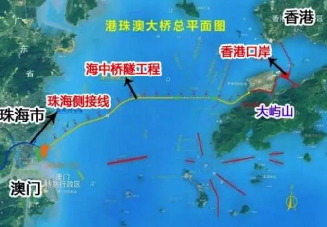 粤港澳湾区的超级工程——港珠澳大桥预计今年底实现通车。大桥贯通后,珠海至香港的交通时间将由现在水路约1小时、陆路3小时以上,缩短到半小时左右,实现珠海、澳门与香港的陆路对接。以下为港珠澳大桥平面图: