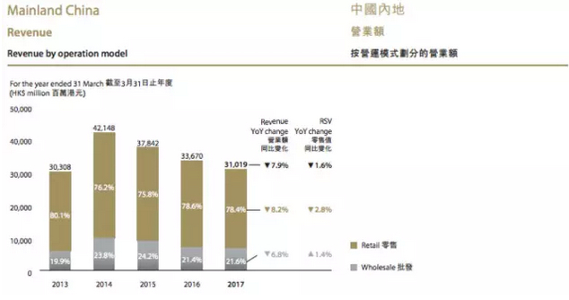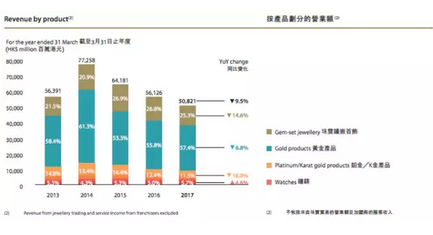周大福的财报数据也较为惨淡,其2017财年年报(2016.3.31-2017.3.31)数据显示,2014年至2017年总营业额从774.1亿港元下降到了512.5亿港元,下降幅度为33.8%。作为其核心主战场的中国内地,营业额更是从421.5亿港元直降至310.2亿港元。