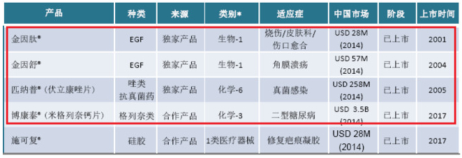 金因肽(GeneTime)可用于手术切口和慢性伤口等症状,包括皮肤烧伤、整形手术、慢性溃疡,甚至是妇产科手术与骨科矫形等手术切口。药品所含有的rhEGF(重组人表皮生长因子)活性成分能够直接作用于表皮细胞,治疗皮肤伤口,并通过细胞增生、分化和存活加速愈合过程,从而缩短治疗时间并淡化伤疤。金因肽是国内目前唯一的rhEGF喷雾制剂,采用无菌包装,方便患者与医师使用。这个品种在2009版医保目录仅适用于工伤报销,但2017版取消了报销限制。联康生物2016年全年平稳增长5.6%
