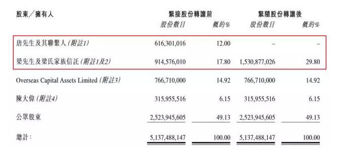 2016年12月23日,唐洁成向个人陈大伟出售合共3.16亿股(约6.15%),价格为每股股份0.165港元,较前日收市价0.15港元溢价10%。