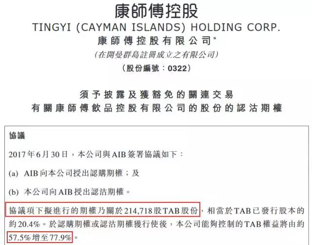 也就是说,在 2019 年交易完成后,TAB 将成为康师傅 (77.9%) 及其母公司 (22.1%) 的全资子公司。