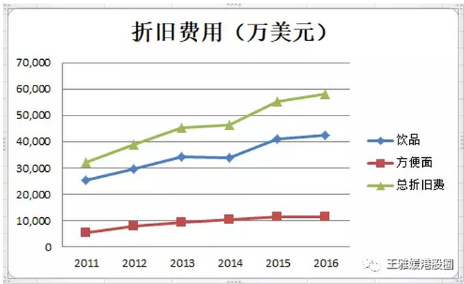 如图,红色的为方便面折旧费用,基本上最近三年都已经稳定下来了。相反,蓝色为饮品折旧费用,最近三年却在大幅上升。