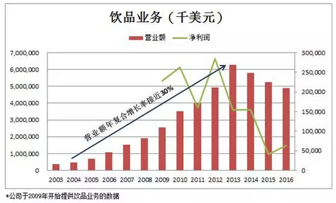 康师傅与朝日集团合作后的十年,即2004年~2013年,饮品营业额的年复合增长率接近30%。于2013年后,康师傅的饮品方面的营收和利润持续下滑。