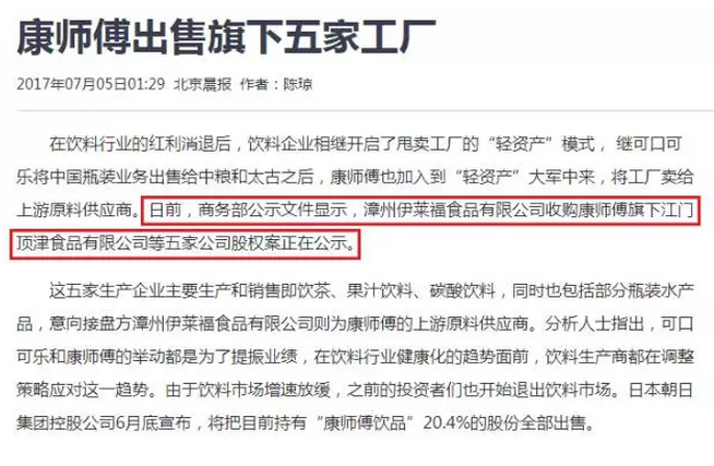 市场对于康师傅卖出旗下5家工厂的理解是,康师傅学习可口可乐,沽出重资产,转型轻资产模式。