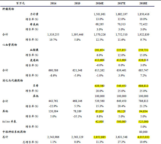 查看原图肿瘤线2016年实现销售额约15.7亿元,我们预计其中力扑素的占比约为95%,增速约为13%-15%。