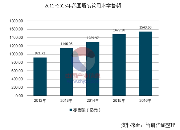 2012年至2016年期间,我国瓶装饮用水市场的销售额从921.72亿元增长到1543.6亿元。其中,高端水在市场中的表现尤为抢眼。