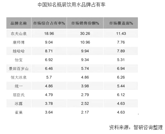 我国瓶装饮用水的主要品牌有农夫山泉、康师傅、娃哈哈和怡宝等品牌,这些品牌的市场销售份额占据我国瓶装饮用水市场的半壁江山,其中农夫山泉的品牌占有率最高,达到了18.96%。其次是康师傅为9.04%,与农夫山泉还有很大的差距。