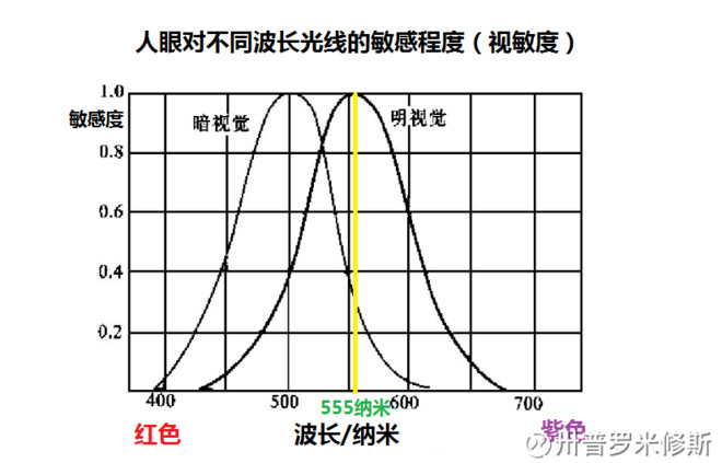 首先要清楚光度学里的物理量,包括光强度、光亮度、光通量都是按人眼主观上对光的感觉来度量,即辐射光能够被人眼所感受到的那部分有效当量,上篇已经说了,人眼对不同颜色的光线敏感度不同,所以如果光源辐射功率一样,但是发出的光线颜色不同,那么在人眼里的亮度也是不同,比如一个光源发出波长500nm的光线,另一个光源发出555nm的光线,则在人眼看来前者只有后者亮度的1/3。