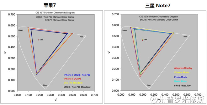 下面是苹果LCD和三星OLED屏幕在不同显示模式下的色域对比,OLED有一些优势但并不明显。