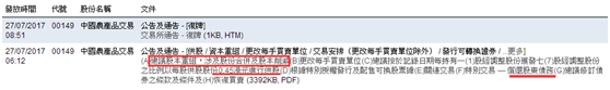 6时12分,中国农产品率先发布一项涉及7方面的公告,如建议股本重组,涉及股份合并及股本削减;更改每手买卖单位;以每股供股股份0.45港元进行供股;根据特别授权发行及配售可换股票据;关连交易;特别交易偿还股东债务等。并宣布将于今天(27/7/2017)上午九时正起恢复买卖。