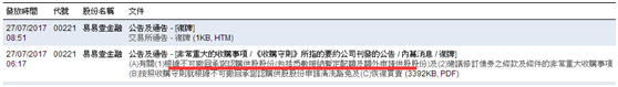 间隔一分钟,易易壹金融公告,宣布据不可撤回承诺认购供股股份(包括悉数接纳暂定配额及额外申请供股股份,并将于今天(27/7/2017)上午九时正起恢复买卖。