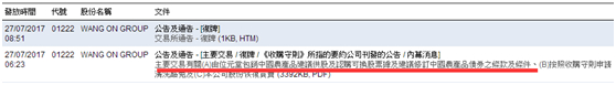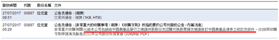 不到6分钟,位元堂也发布一条与宏安集团内容大同小异的公告,称包销由中国农产品发行、建议供股及认购可换股票据及建议修订中国农产品债券之的条款及条件。并将于今天(27/7/2017)上午九时正起恢复买卖。