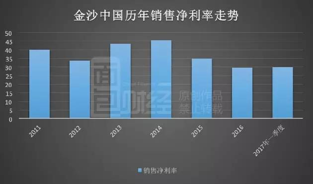 下图为面包财经根据财报绘制的金沙中国历年销售净利率走势: