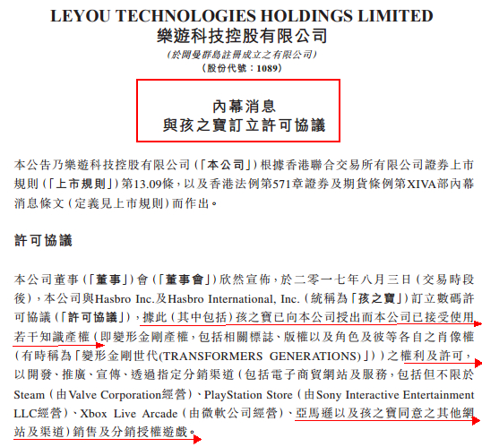 在2017年8月3日,乐游发布与孩儿宝订立许可协议的公告,称孩儿宝已向该公司授出若干知识产权,包括变形金刚等权利许可,乐游无疑又接到新的代理销售订单。而孩儿宝是一家比较老的游戏及娱乐公司了,1923年成立,它的变形金刚在全球有较庞大的游戏迷基础,乐游接下这个代理授权,或许可以打开中国市场,为其自有的Warframe品牌铺路。