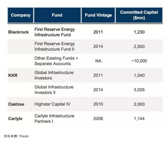 这也是为什么在美国,大部分基础设施PPP项目的投资来自退休养老基金(pension funds)和保险公司等。从下图可见,像Blackrock, KKR, Oaktree, Carlyle这些知名的投资公司在金融危机之后都开始布局基础设施投资。