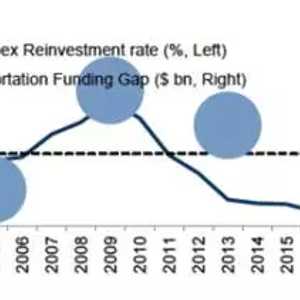 下图为美国过去20余年公共基建资本开支占税收收入比例,及每年的资金缺口。