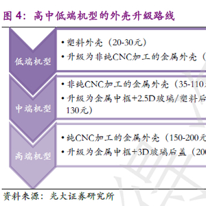 恰逢外壳材质升级关键窗口,布局多元化工艺享ASP提升。基于苹果、三星等全球主流品牌手机外壳历史沿革及应用现状分析,光大证券就高、中、低端机型梳理出手机外壳升级路径。光大证券认为,低端机型预计将由20-30元的塑料外壳升级为35-110元的非纯CNC 加工的金属外壳。中高端机型将逐步采用“金属中框+非金属后盖”这一方案,中端机型将由35-110元的非纯CNC加工金属外壳升级为120-130元的“金属中框+2.5D 玻璃/塑料后盖”方案,高端机型则将由150-200元的纯CNC金属外壳升级为200-300元的“金属中框+3D玻璃后盖”方案。外壳供应商可因此享受可观的ASP 提升。