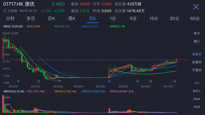 增长状态难延续、业绩不稳定也让澳优的股价在震荡中一路下行,前复权看最低时为1.129港元,较发行价4港元的发行价,减少72%。直至2016年,澳优的收入和利润均出现明显好转,其股价才开始爬升。