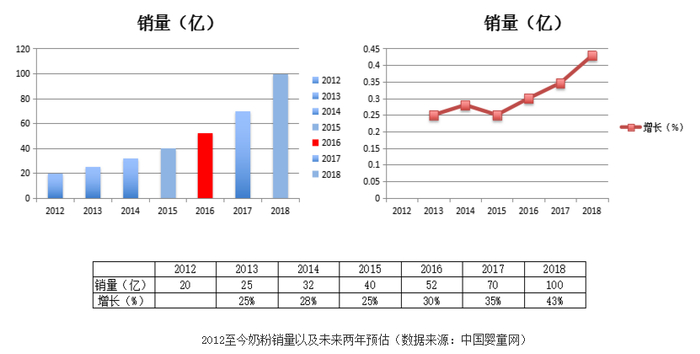 公开数据显示,2016年,中国的羊乳业市场销量已经达到50亿。随着消费者对羊奶产品认可度的不断提升,未来羊奶粉市场销量或将呈快速上涨态势,在2018年达到100亿。这对澳优来说,无疑也是一个好消息。