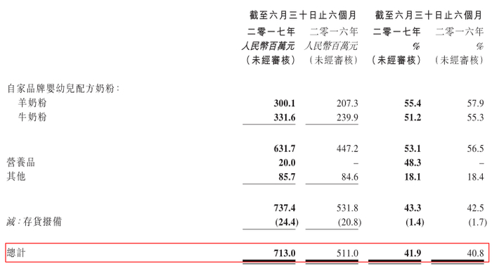 今年上半年,澳优的自家品牌婴幼儿配方羊奶粉及牛奶粉的收入增加50.1%至11.89亿元,占其总收入的69.8%。其中羊奶粉在中国的销售额同比增长55%至4.5亿,在海外的销售额同比增长34.7%至9160万;牛奶粉的销售额同比增长49.1%至6.47亿。