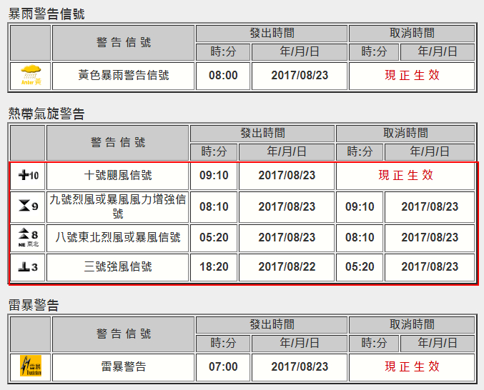 香港天文台于23日9时10分发出十号飓风信号。